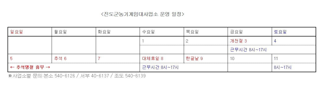 추석명절 진도군 농기계임대사업소 휴무일 및 운영 일정 안내