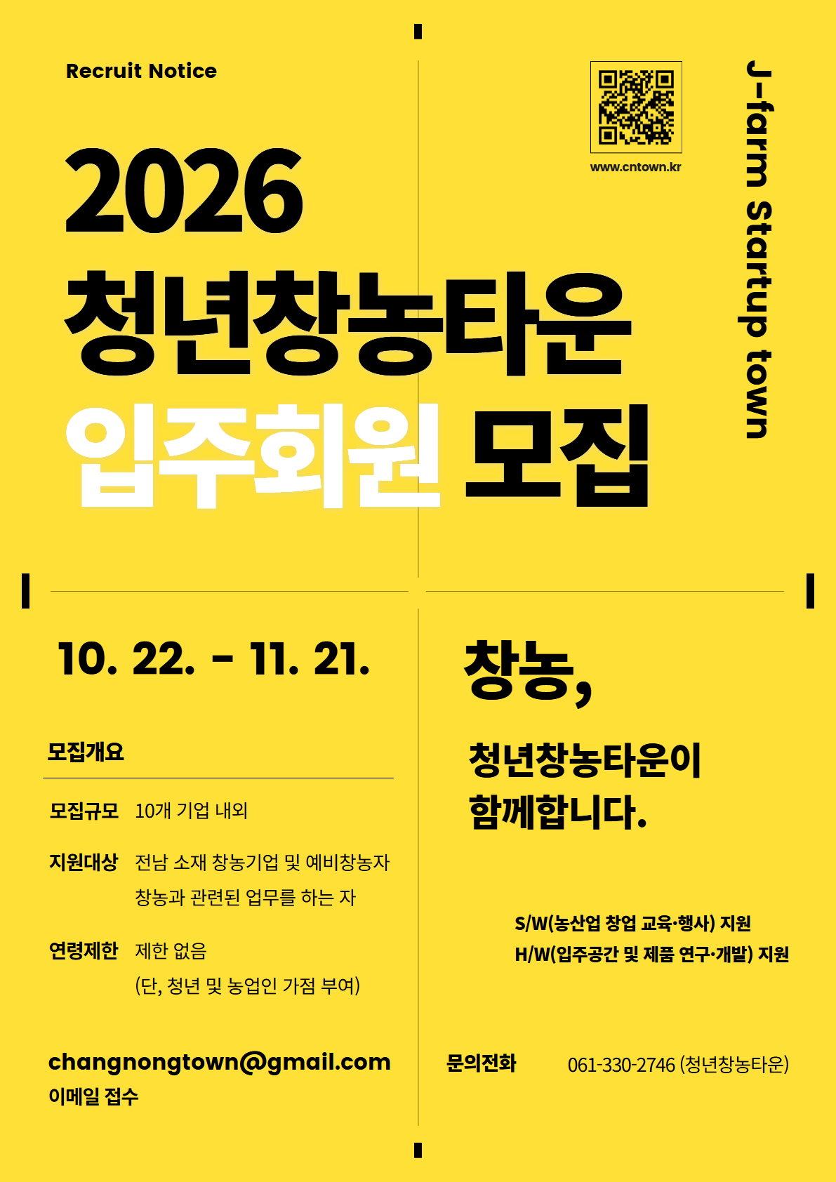 공지사항 2026년 전라남도 청년창농타운 입주회원 모집공고 농업기술센터 2025-10-24 15:07 조회 687 첨부파일 2026년전라남도청년창농타운입주회원모집공고.hwp 다운로드 이전글 2025년 어르신 소농 직불금 지원사업 사업명 변경 알림 다음글 2025년 어르신 소농 직불금 지원사업 시행지침 및 신청 안내 목록 제공되는 서비스에 대하여 만족하십니까? 만족도 60% 고객만족도 평가 매우만족 만족 보통 불만족 매우불만족 QR Code 이미지를 스마트폰에 인식시키면 자동으로 이 페이지로 연결됩니다. 이 QR Code는 『공지사항』의 정보를 담고 있습니다.