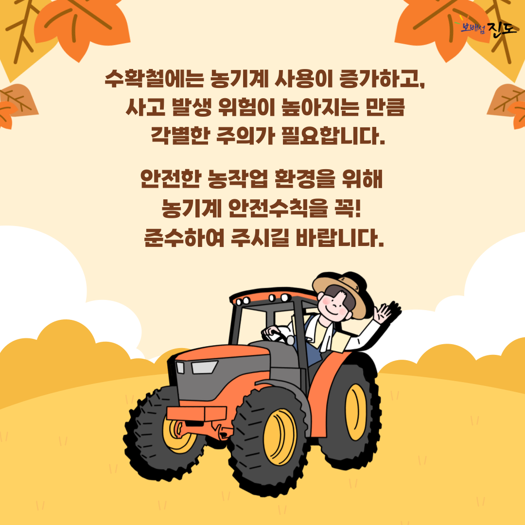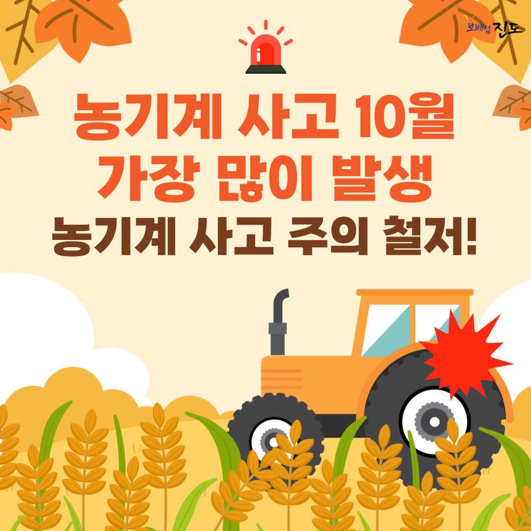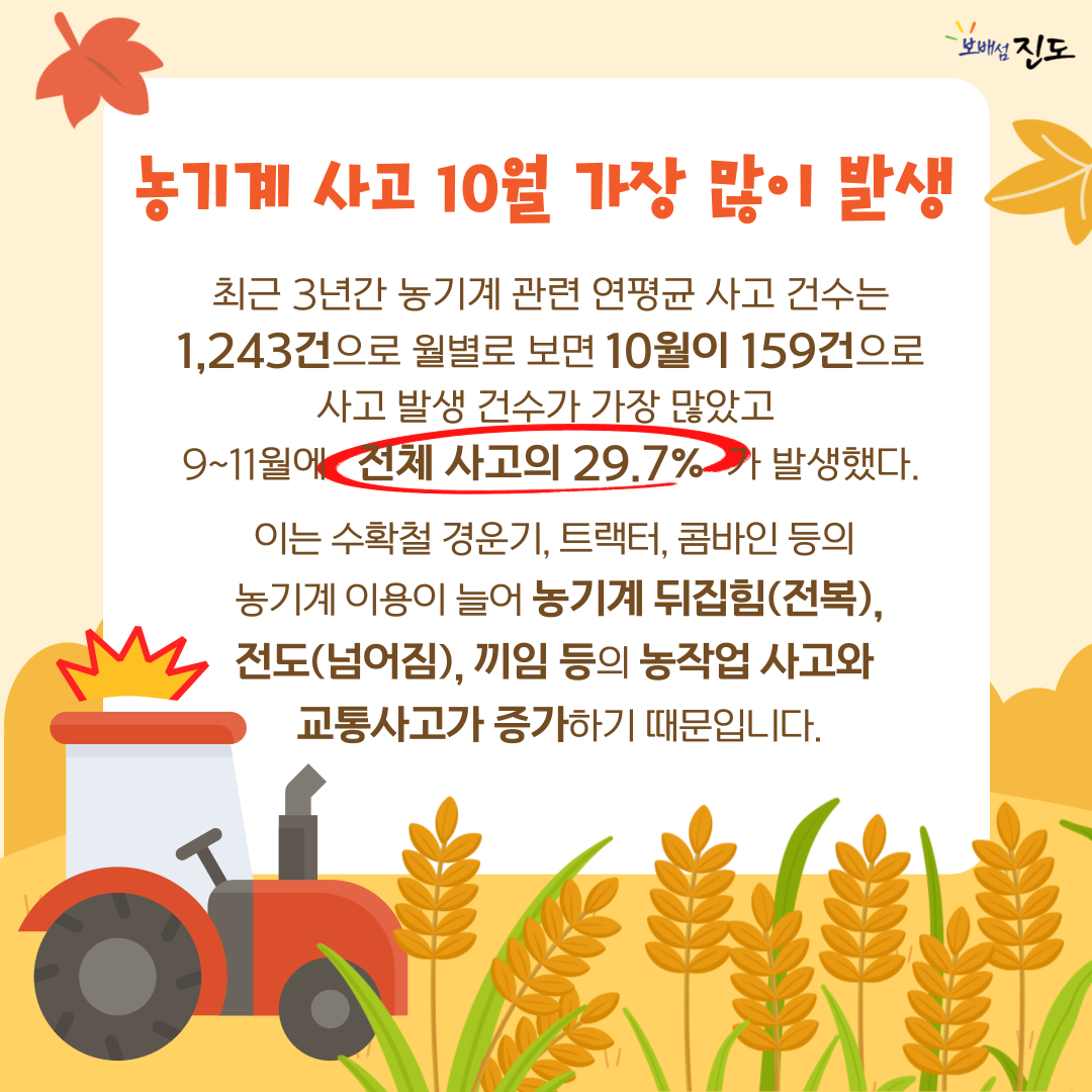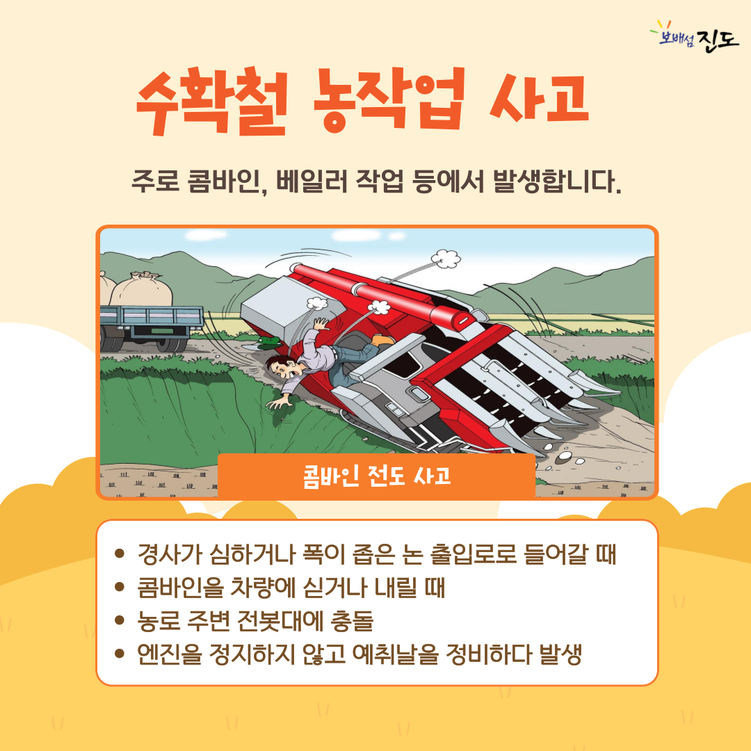 가을 수확철 경운기, 트랙터, 콤바인 등의 농기계 이용이 늘어 뒤집힘(전복)‧전도(넘어짐), 끼임 등의 농작업 사고와 교통사고가 증가하기 때문입니다.