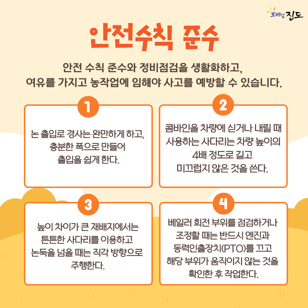 안전한 농작업 환경을 위해 농기계 안전수칙을 꼭! 준수하여 주시길 바랍니다.