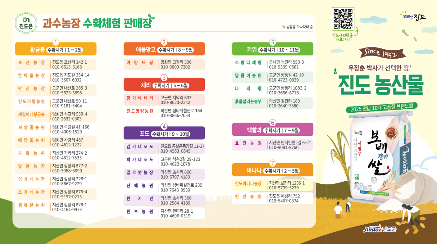 특히, 농림축산식품부에서 인증하는 지리적표시 4대 우수 농산물인 진도검정쌀, 진도대파, 진도구기자, 진도울금과 조도쑥, 월동배추, 유자, 단호박 등 총 15개 품목을 담았다.
