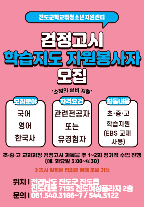 진도군학교밖청소년지원센터 검정고시 학습지도 자원봉사자 모집합니다.