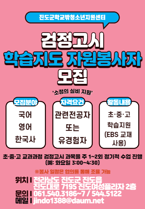 진도군학교밖청소년지원센터 검정고시 학습지도 자원봉사자 모집합니다.