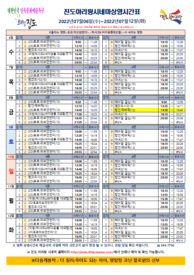 진도아리랑시네마 상연시간표 <2022.07.06(수)~07.12(화)> 안내드립니다.