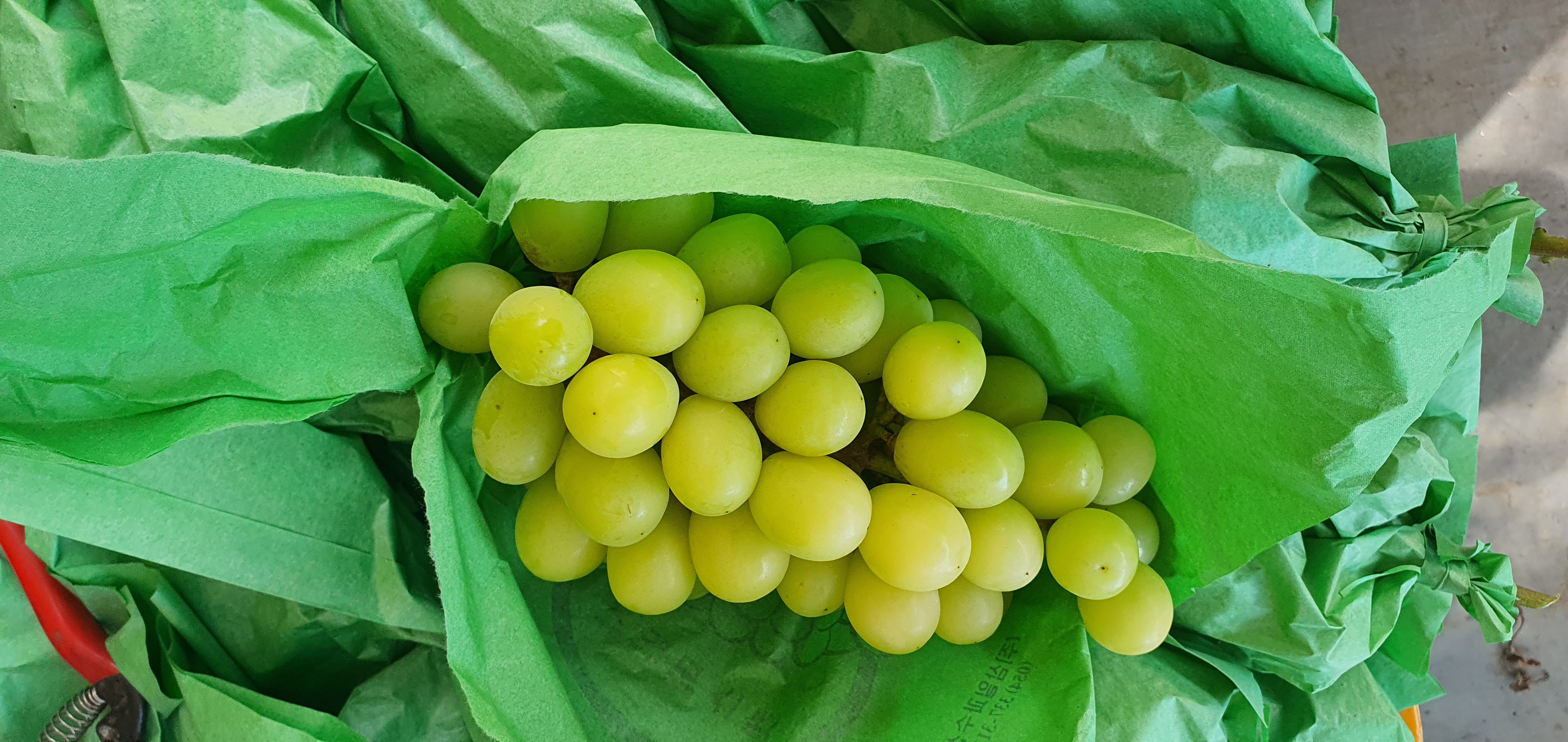 샤인머스켓 (Shine Muscat) : 마스카토향을 내고 껍질째 먹는 씨없는 청포도로 알이 굵고 단단하며, 망고맛이 난다고해서 망고포도로 불러지고 있답니다.  캠벨보다 월등히 높은 18.0~22.0°Bx 이상의 당도와 아삭아삭한 식감이 일품인 포도랍니다. 껍질째 먹는 씨없는 청포도라 아이들뿐만아니라 한번 드셔보신 분들은 샤인머스켓의 향과 식감을 잊지못해 다시 찾는 분들이 많은 요즘 아주 핫한 고급포도랍니다.