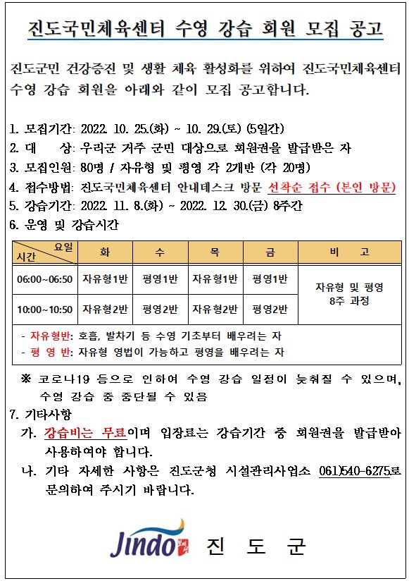 진도국민체육센터(실내수영장) 수영 무료 강습 회원 모집 일정 안내