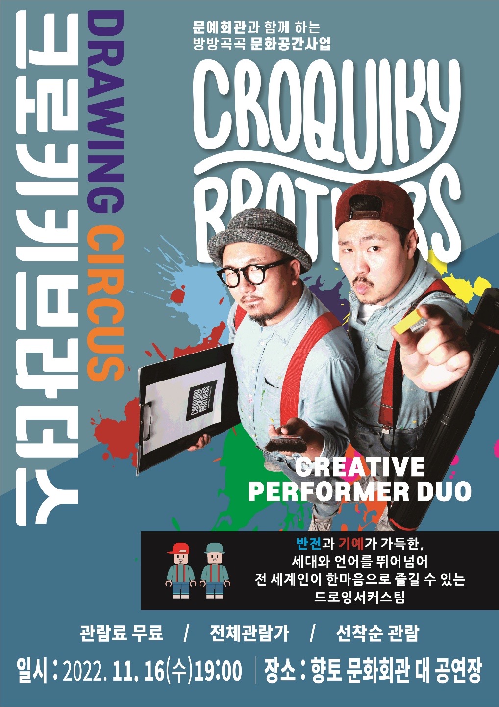 - 일시 : 2022. 11. 16.(수) 19:00 - 장소 : 향토문화회관 대공연장 - 내용 : 드로잉서커스 공연 - 관람료 무료(선착순) "유쾌하게 그림 그리는 퍼포먼스 듀오" "완성된 그림이 아닌 그림이 그려지는 과정을 즐길 수 있는 공연" 많은 관람바랍니다.