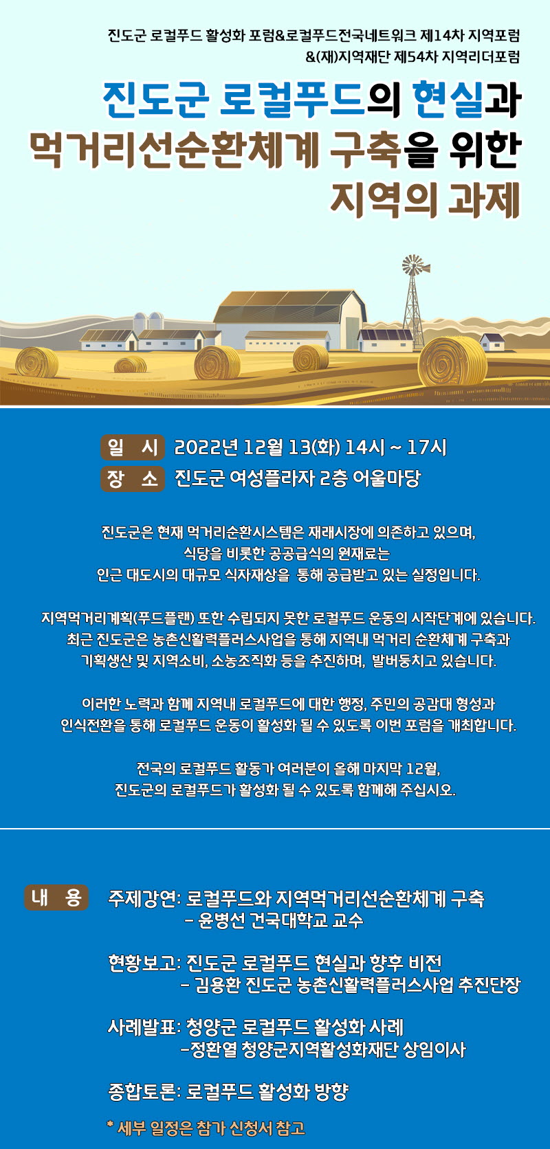 *******지역내 로컬푸드에 관심있으신 모든분들 참여가능 ******** ♦ 주 관 : 진도군 농촌 신활력플러스사업 추진단 ♦ 연락처 : 061-544-0138