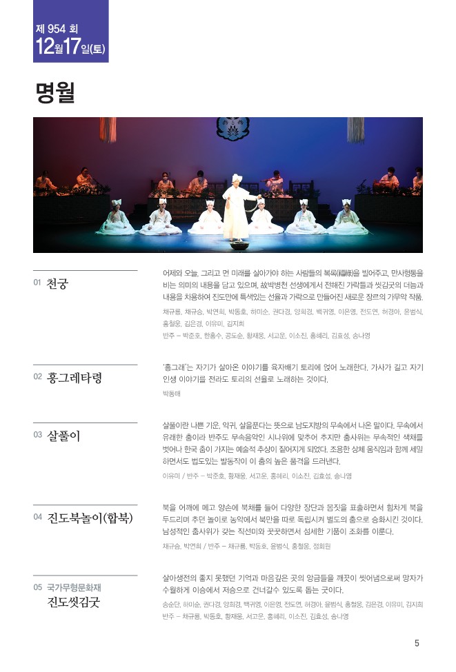 천궁, 흥그레타령, 살풀이, 진도북놀이, 진도씻김굿 등 다양한 공연이 준비되어 있습니다.