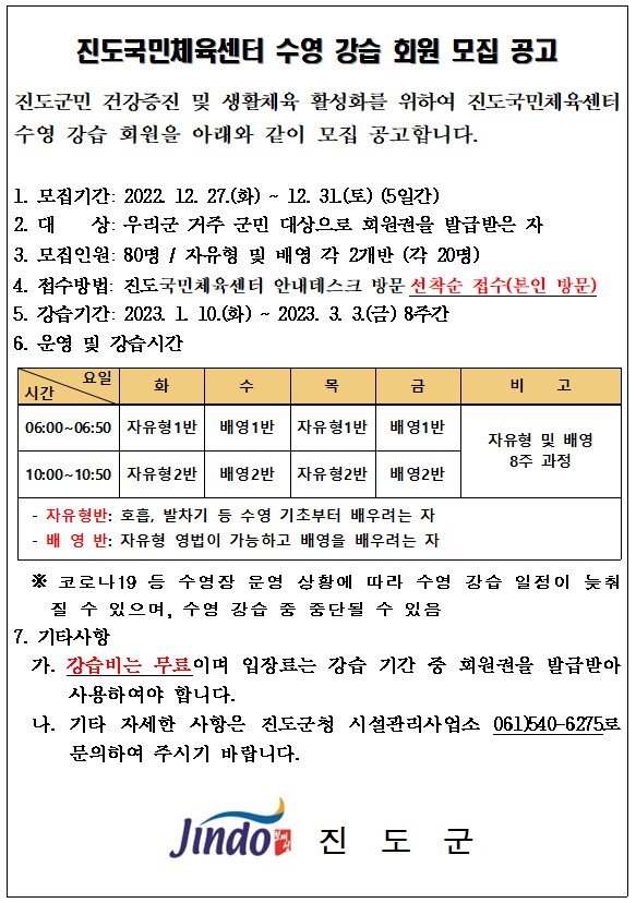 진도국민체육센터(실내수영장) 수영 무료 강습 회원 모집 일정 안내[2023년도 1회차]