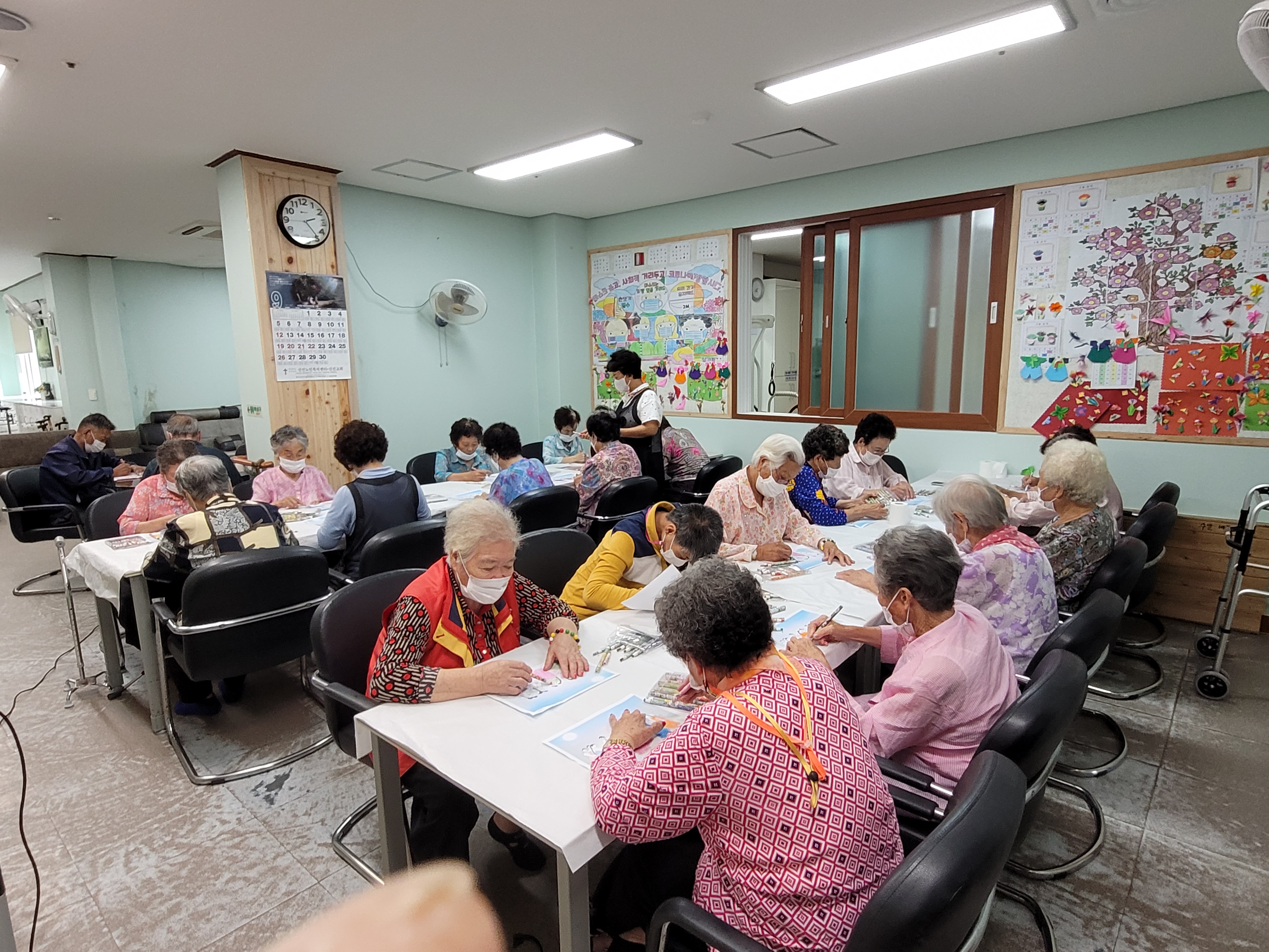 인지상태에 맞는 맞춤형 프로그램에 참여하여 도안에 색칠을 하는 어르신들!