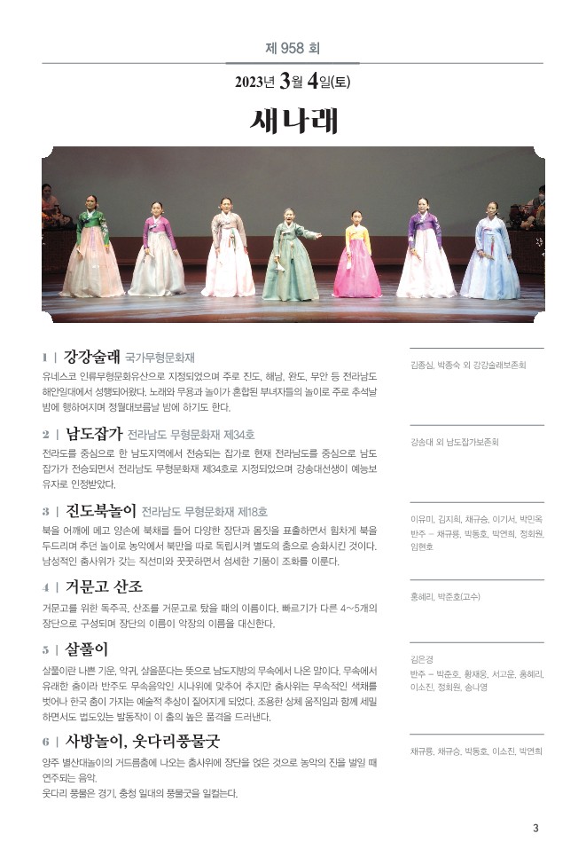 제958회 진도토요민속여행 상설공연이 "새나래"를 주제로 펼쳐집니다.