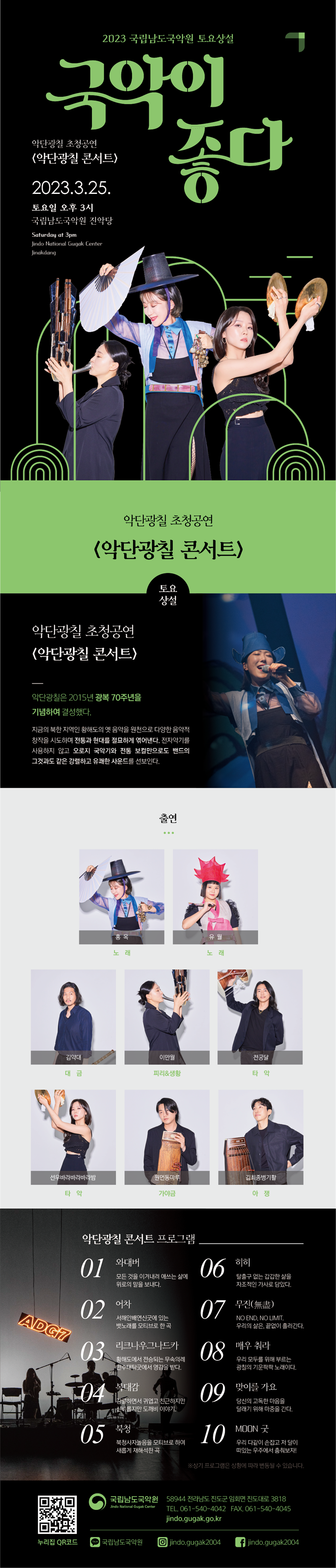2023 토요상설 <국악이 좋다> 3월 마지막 주 공연은 악단광칠 초청공연입니다.