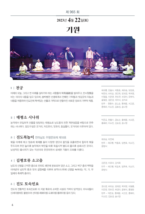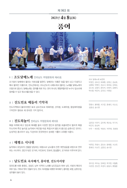□ 공연개요 ○ 공 연 명 : 진도토요민속여행 상설공연 ○ 공연일시 : 2023. 4. 매주토요일 14:00 ~ 15:30 ○ 공연장소 : 향토문화회관 대공연장