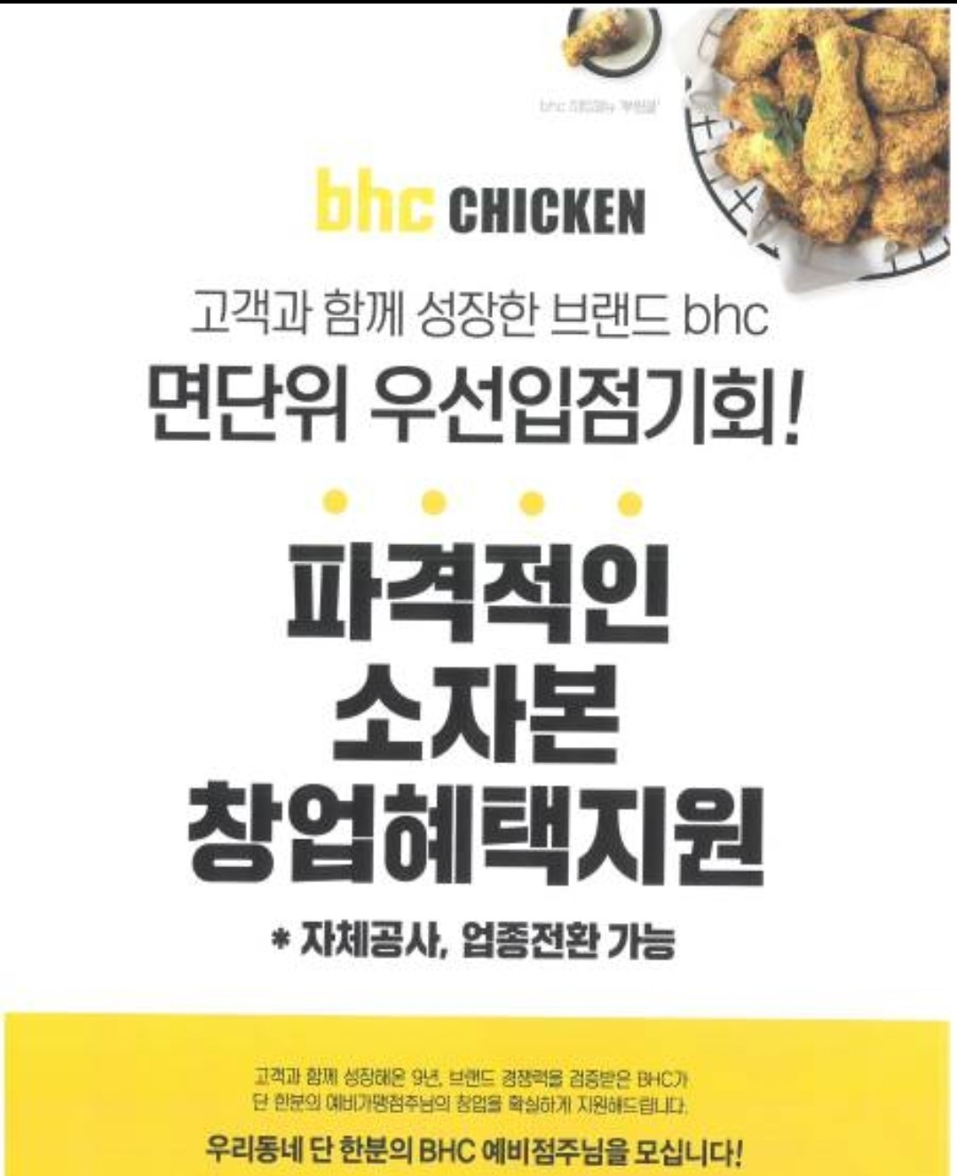 ★'치킨 프랜차이즈 매출1위' bhc치킨 프랜차이즈에서 면단위 창업 진행 시 '아주 특별한 혜택' 으로 창업을 도와드리고 있습니다. 전국 각 지역에서 이미 검증된 매출과 경쟁력으로 면단위에서 성공적인 창업!! 궁금하신점은 아래 연락처로 연락 주시면 친절히 안내해드리겠습니다. * o.1.oㅡ7.1.7.oㅡ7.9.9.3 *