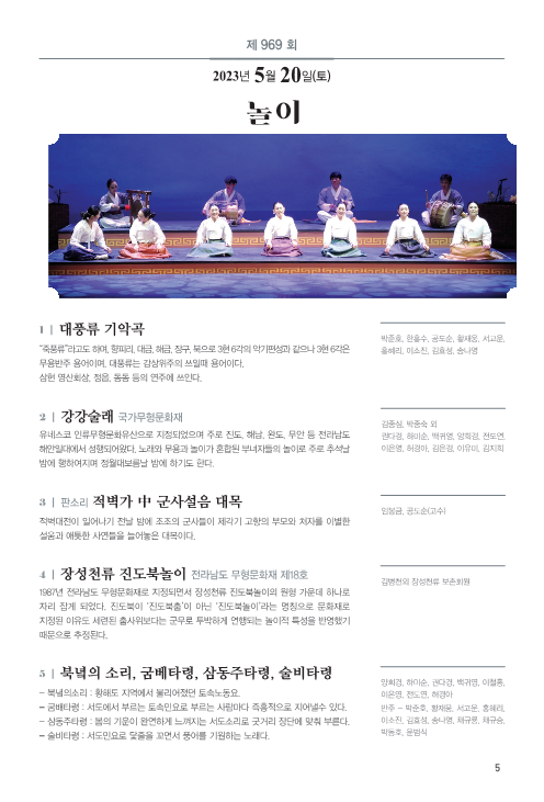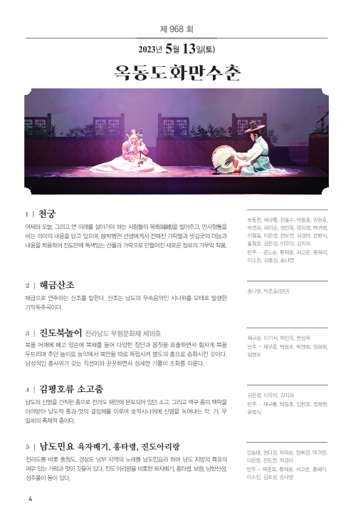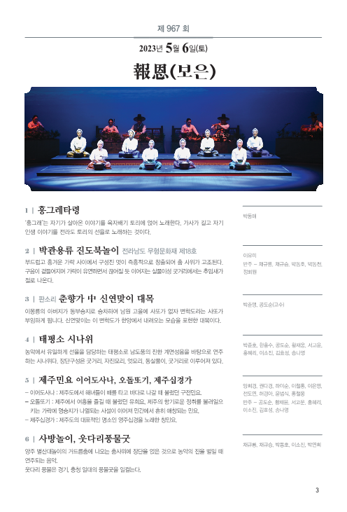 □ 공연개요 ○ 공 연 명 : 진도토요민속여행 상설공연 ○ 공연일시 : 2023. 5. 매주토요일 14:00 ~ 15:30 ○ 공연장소 : 향토문화회관 대공연장