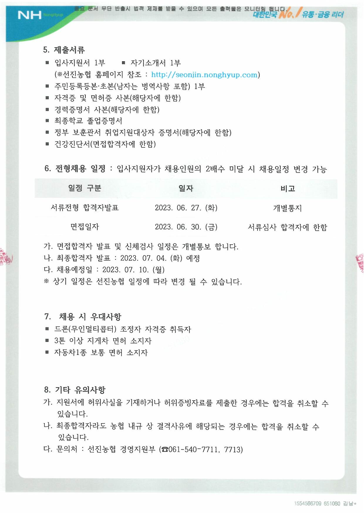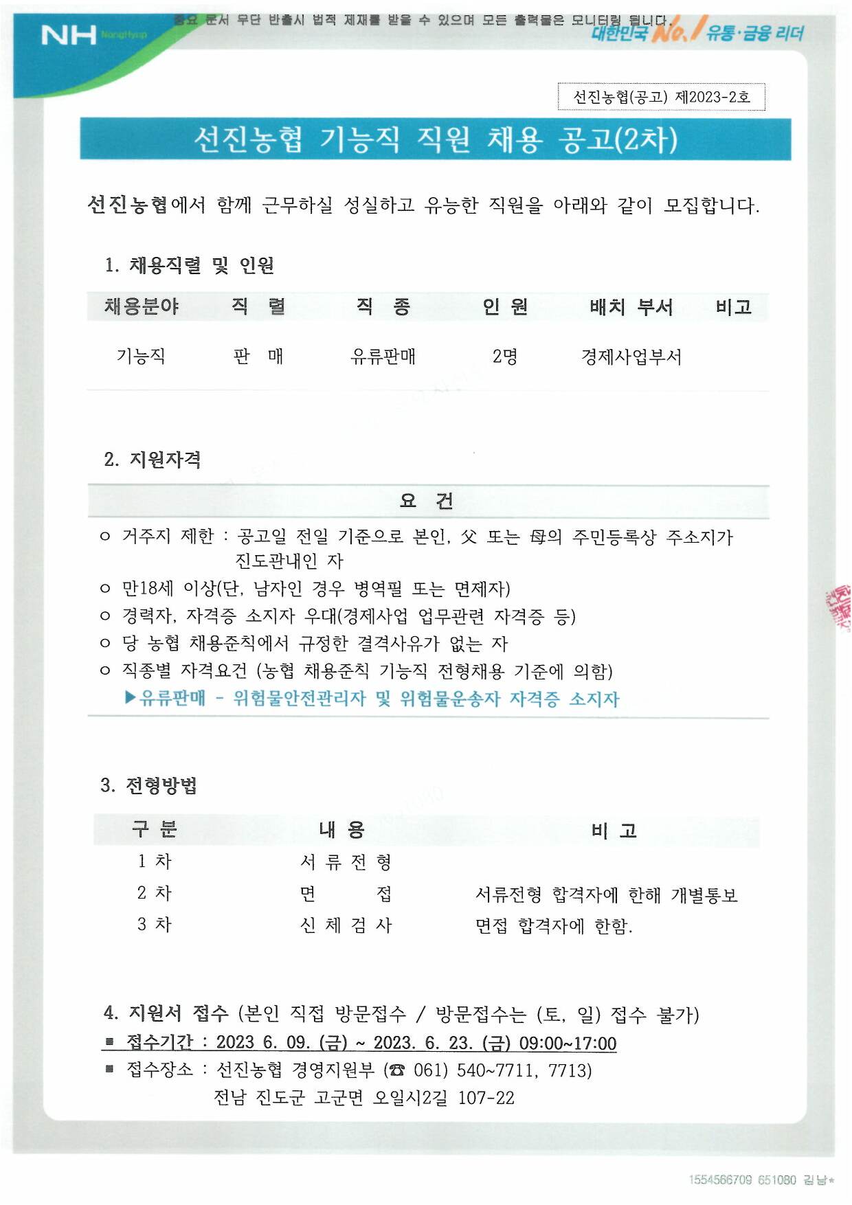 저희 선진농협에서 함께 근무할 기능직 직원을 아래와 같이 모집합니다. 자세한 내용과 지원서류 등은 선진농협 홈페이지에 게시되어있습니다. 문의사항은 선진농협 경영지원부로 방문하시거나, 061-543-7711, 7713 으로 전화문의주시기 바랍니다. 많은 관심과 지원 바랍니다.