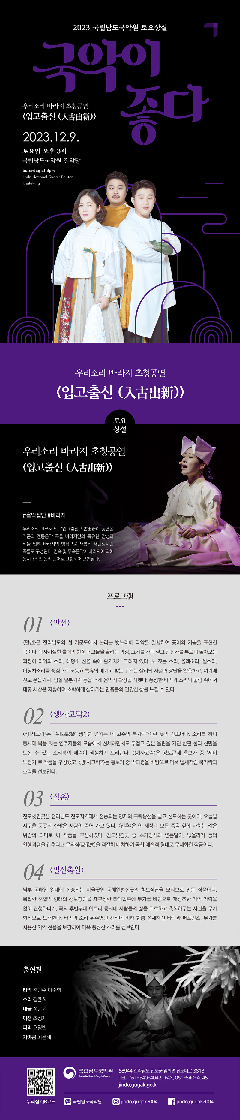 ★ [국립남도국악원] 토요상설 <국악이 좋다> 『우리소리 바라지 초청공연 <입고출신 入古出新>』 ★