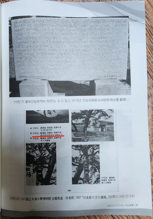 →아랫당을 ‘굴포마을 할아버지당(윤선도공덕비)’으로 표기. 윗당을 사진과 함께 ‘굴포리 할머니당’으로 표기하고 있다. 사진 자료에 한정된 것으로 보면, 연구자가 ‘신당유적비문’ 또는 ‘진도군의 문화유적’ 내용을 참고했을 것으로 추정된다.