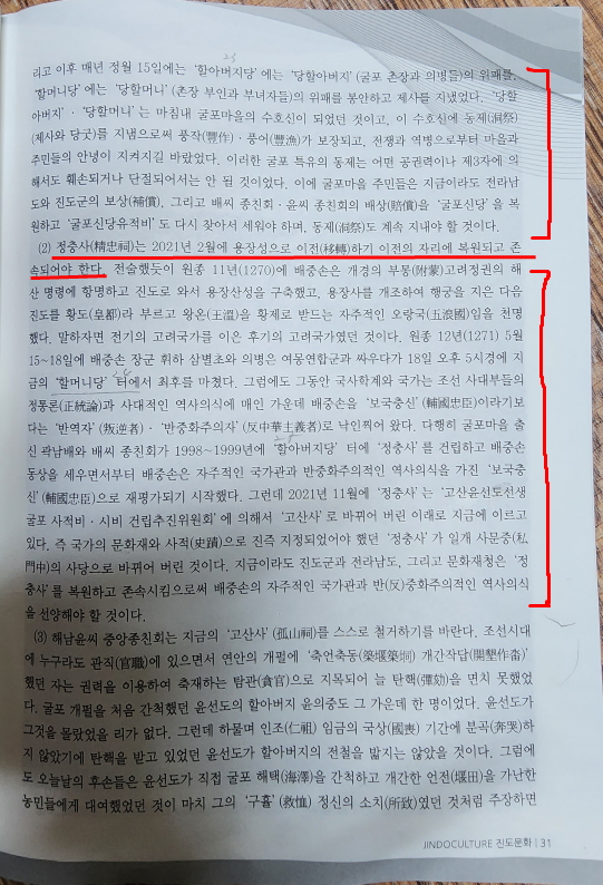 ‘(2)정충사는 2021년 2월에 용장성으로 이전하기 이전의 자리에 복원되고 손속되어야 한다. ... (중략) 그런데 2021년 11월에 정충사는 고산윤선도선생 굴포 사적비・시비 건립추진위원에 의해서 고산사로 바뀌어버린 이래로 지금에 이르고 있다. 즉 국가의 문화재와 서적으로 진즉 지정되었어야 했던 정충사가 일개 사문중의 사당으로 바뀌어버린 것이다. 지금이라도 진도군과 전라남도, 그리고 문화재청은 정충사를 복원하고 존속시킴으로써 배중손의 자주적인 국가관과 반중화주의적인 역사의식을 선양해야 할 것이다’