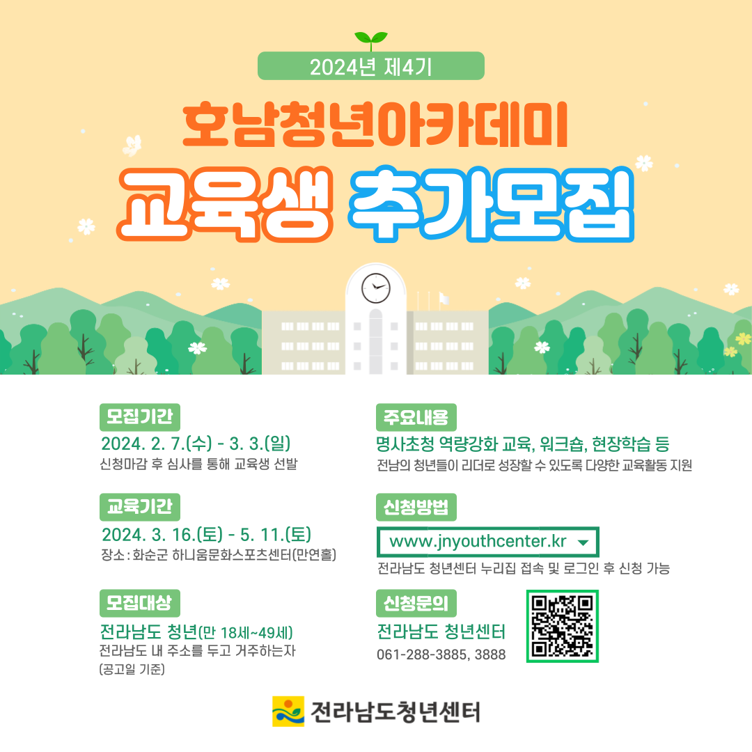 전라남도는 호남 청년 아카데미를 운영하여 청년이 호남의 자존과 자긍심을 가지고 대한민국의 미래 100년을 책임질 핵심 리더로 성장할 수 있도록 지원하고자 다음과 같이 제 4기 교육생을 모집합니다.