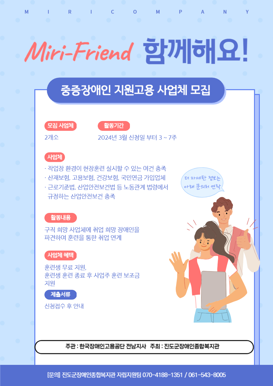 진도군장애인 종합복지관은 한국장애인고용공단(전남지사)에서 주관하는 2024년 중증장애인 지원고용 사업에 위탁기관으로 선정