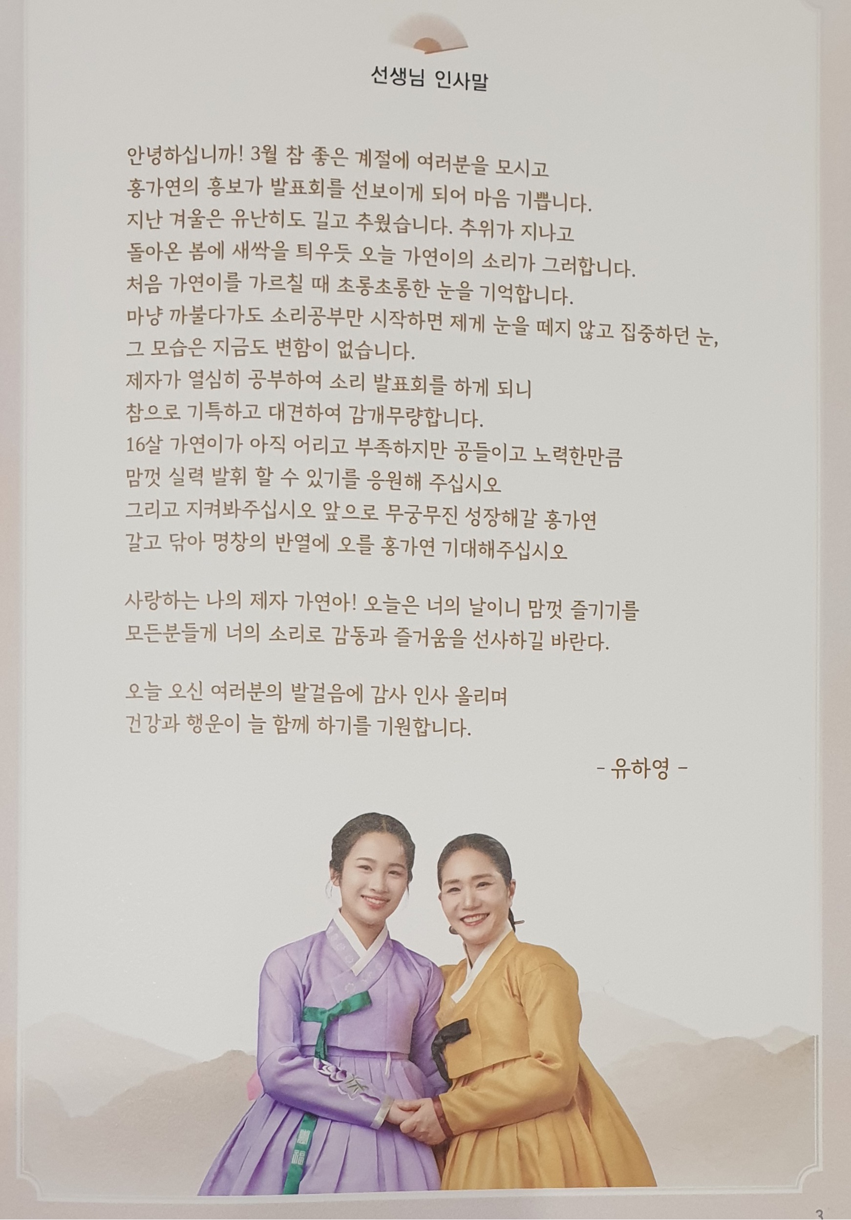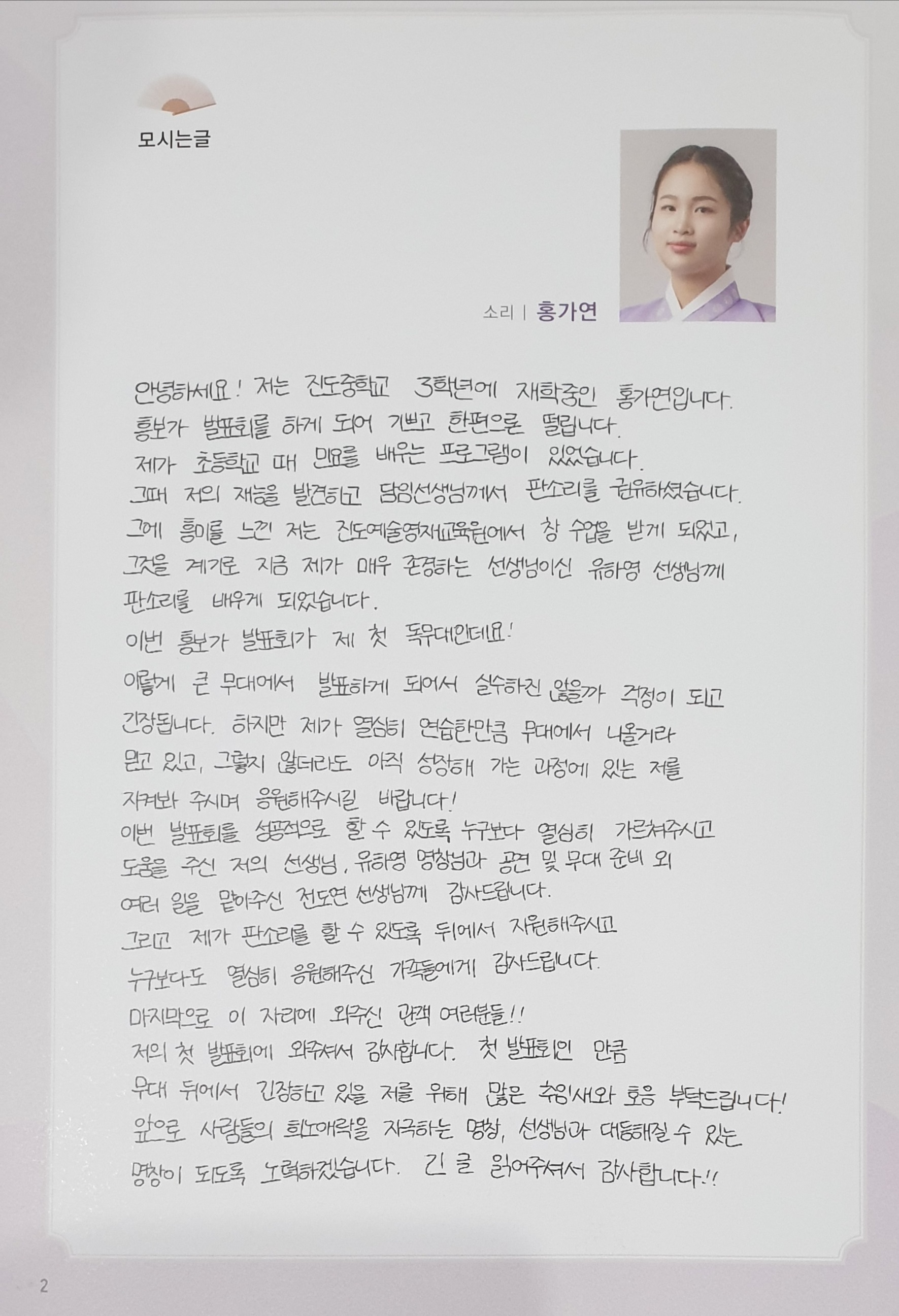 진도중학교 3학년 재학생, 진도의 국악신동 "홍가연"양의 동초제 흥보가 발표회가 있습니다. 많은 응원과 관람 부탁드립니다.<광주약국옆 "이동돼지갈비식당" 손녀입니다.>