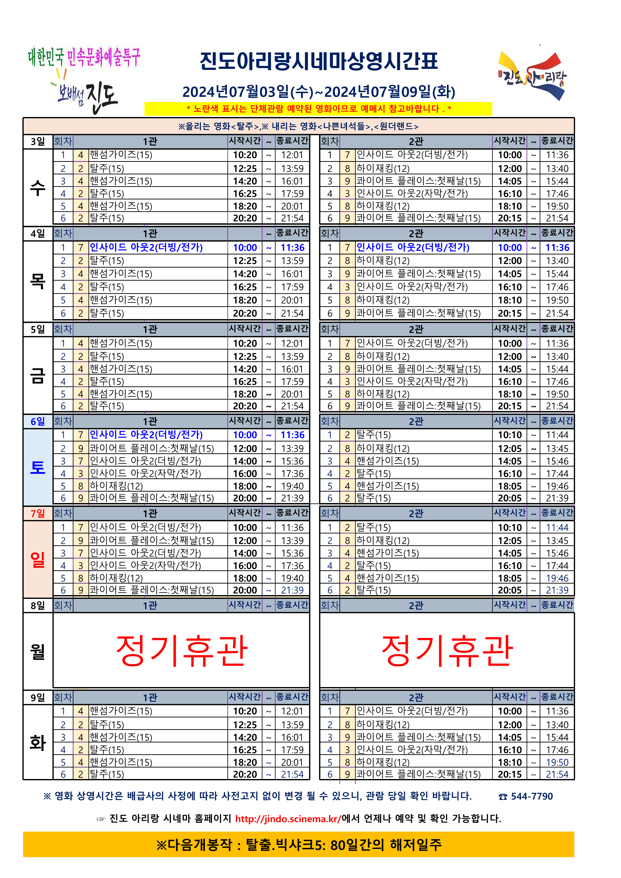 진도아리랑시네마 상영스케줄(2024.07.03(수)~07.09(화)) 안내드립니다.