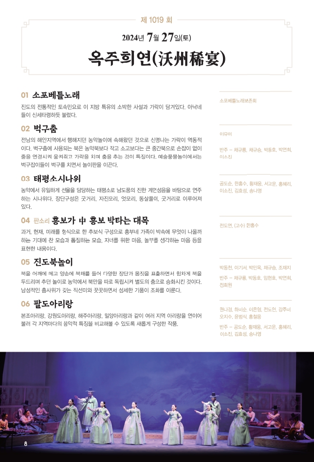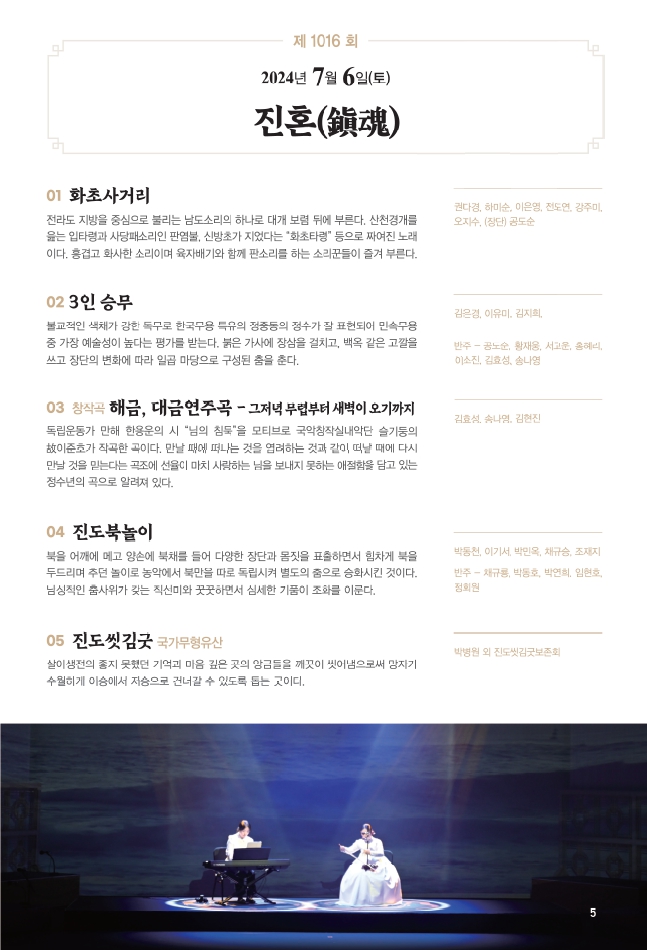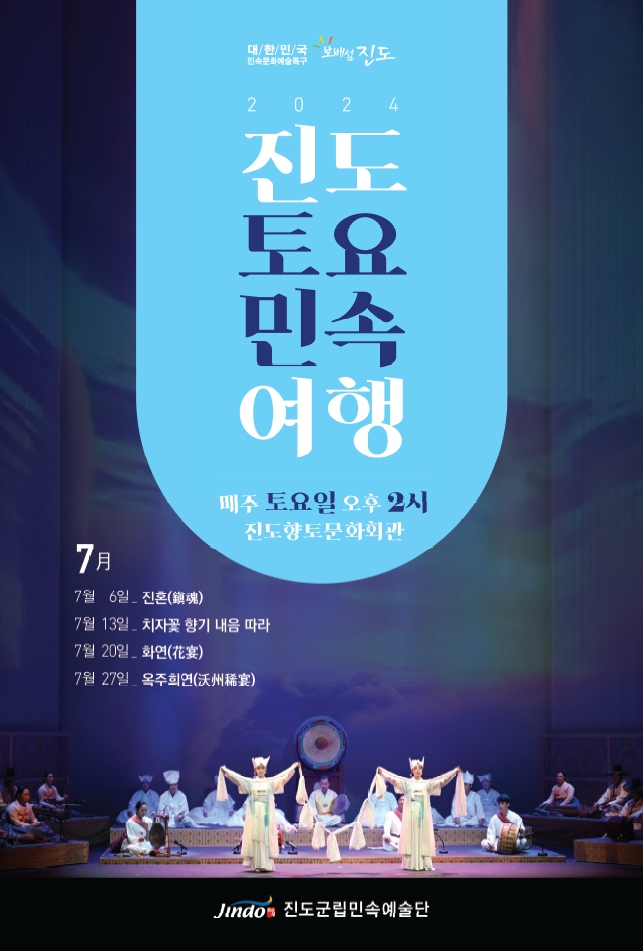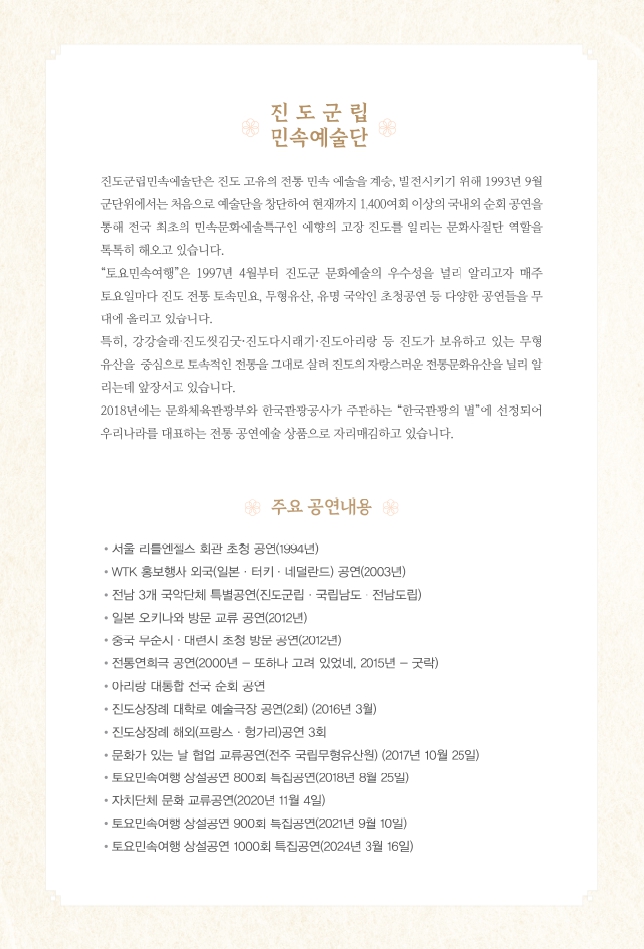 □ 공연개요 ○ 공연명: 진도토요민속여행 상설공연 ○ 공연일시: 매주 토요일 14:00 ~ 15:30 ※ 원활한 공연을 위해 13:50까지 입장 부탁드립니다!!! ○ 관람료: 무료(선착순 입장) ○ 공연장소: 진도향토문화회관 대공연장 많은 관람 바랍니다.