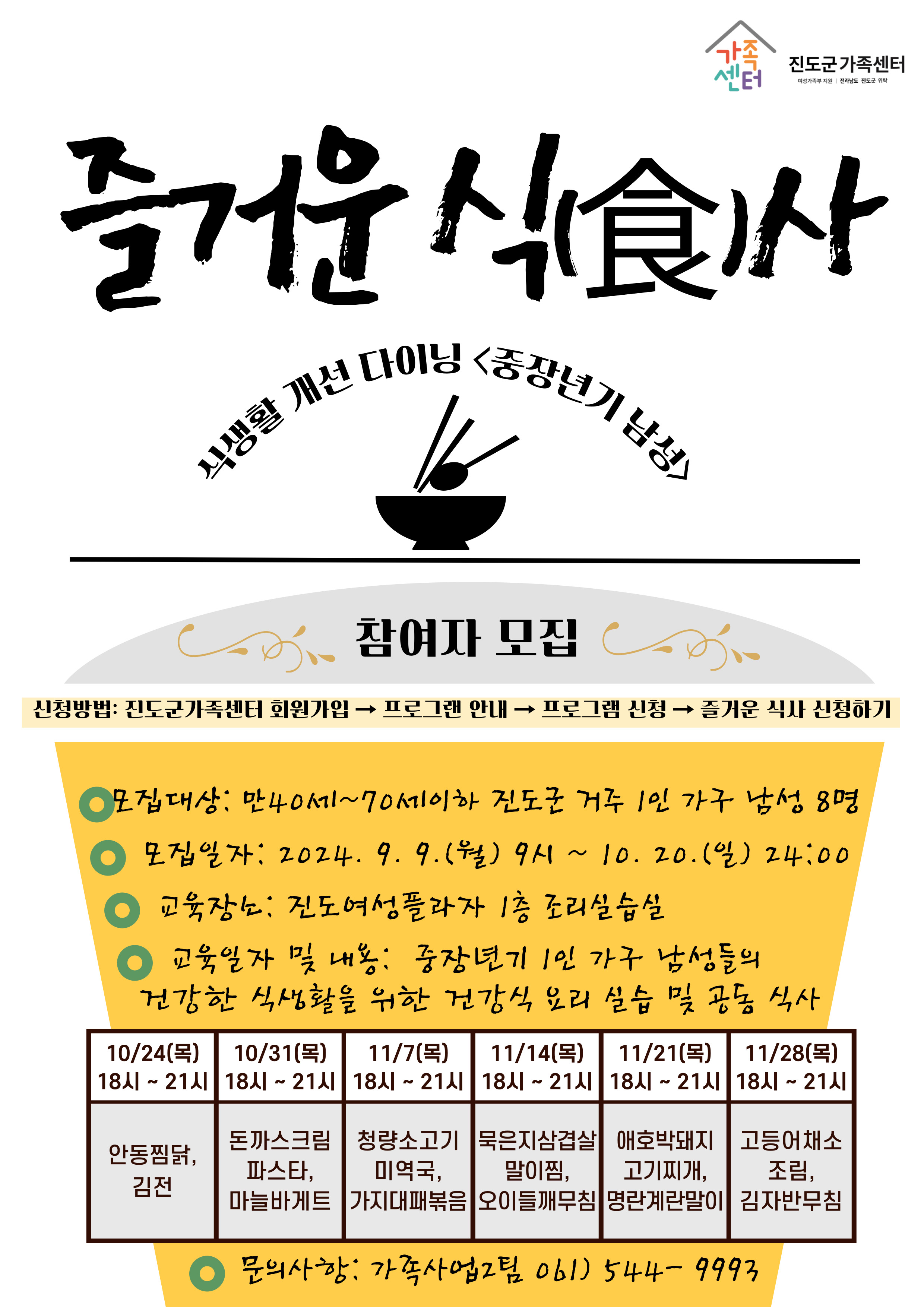 ☆ 진도군가족센터 ☆ <중장년기 요리 활동> '즐거운 식(食)사' 참여자 모집 ☆