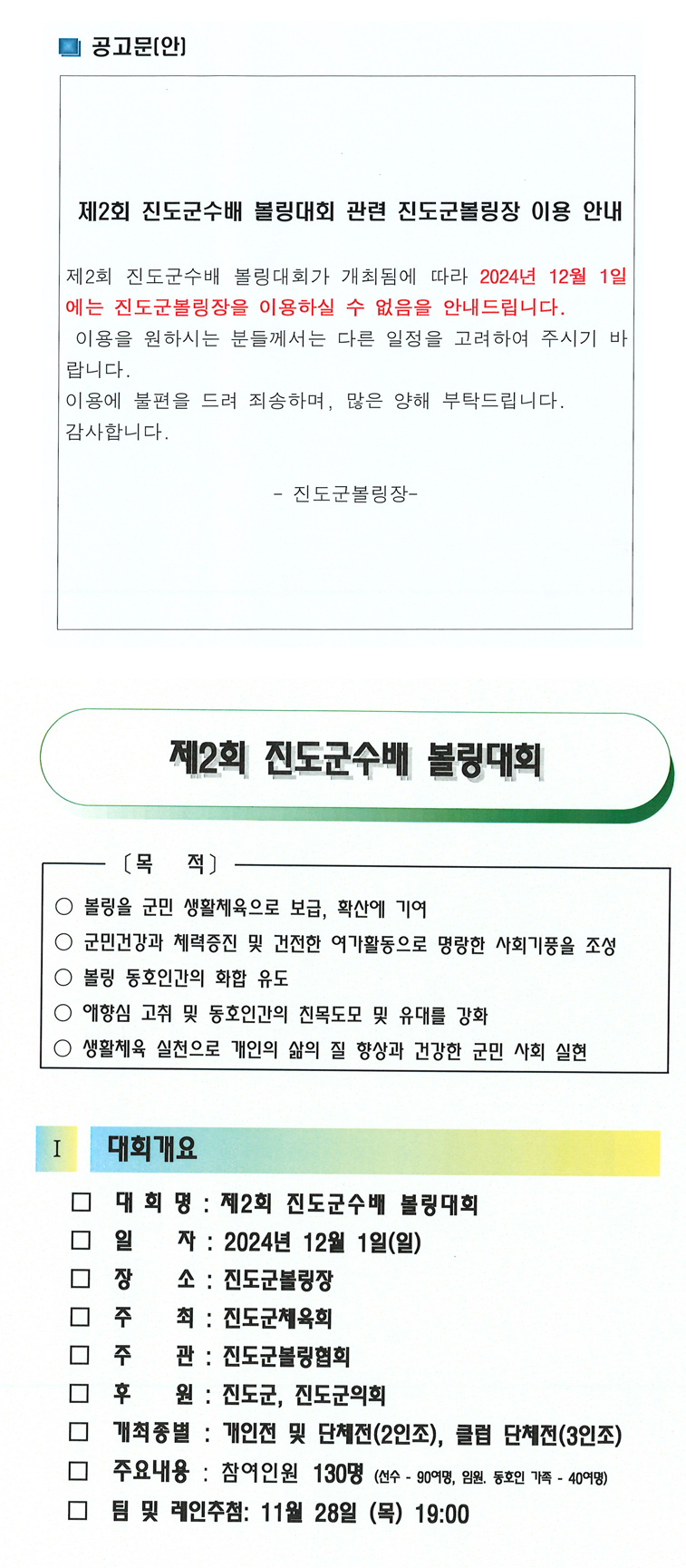 제2회 진도군수배 볼링대회 관련 진도군볼링장 이용 안내