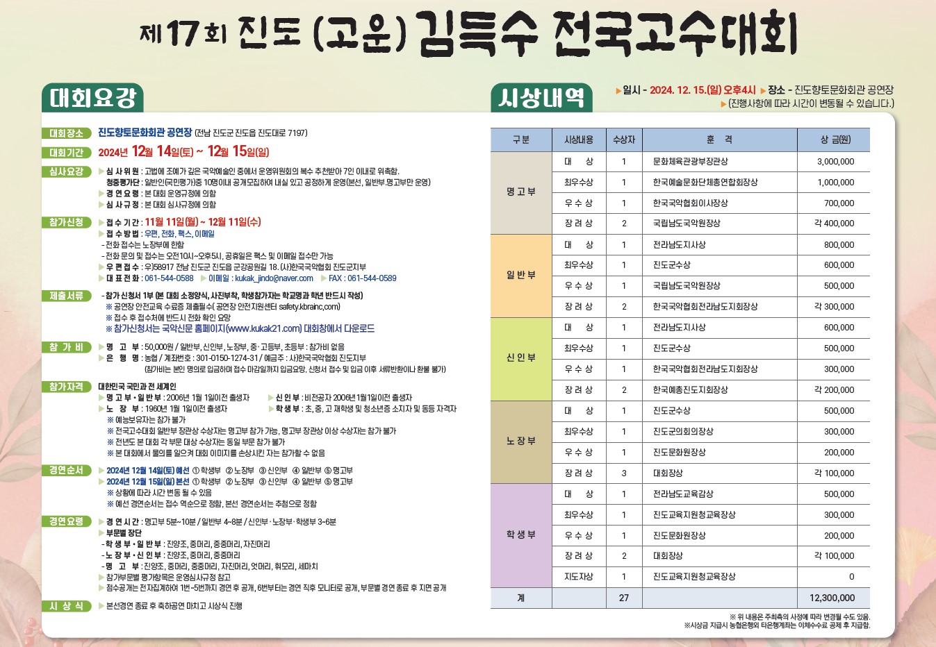 *모집대상 : 20세이상 고법에 관심이 있고 공정한 심사를 위해 적극적으로 참여할 수 있는 진도군민 중 고법 비전공자