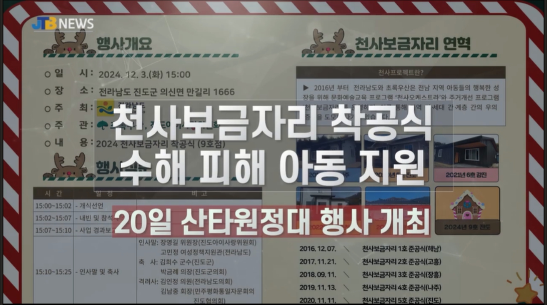 제목 [JTB NEWS/진도투데이] 천사보금자리 착공식, 수해 피해 아동 지원.. 20일 산타원정대 행사 개최