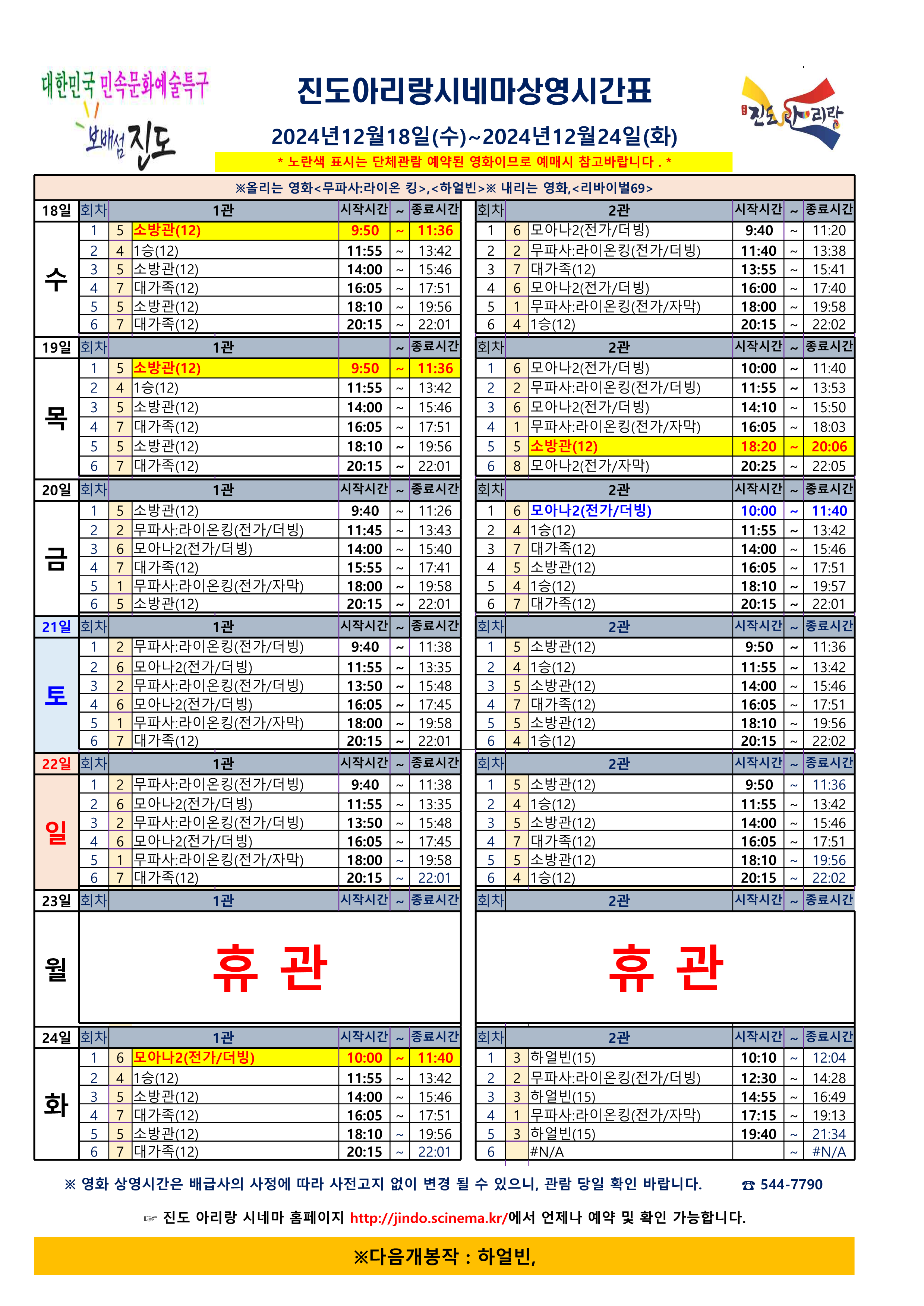 진도아리랑시네마 상영시간표 <2024.12.18(수)~12.24(화)> 안내드립니다.