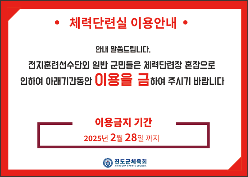 진도군체육회 체력단련실 기간내 이용금지 안내