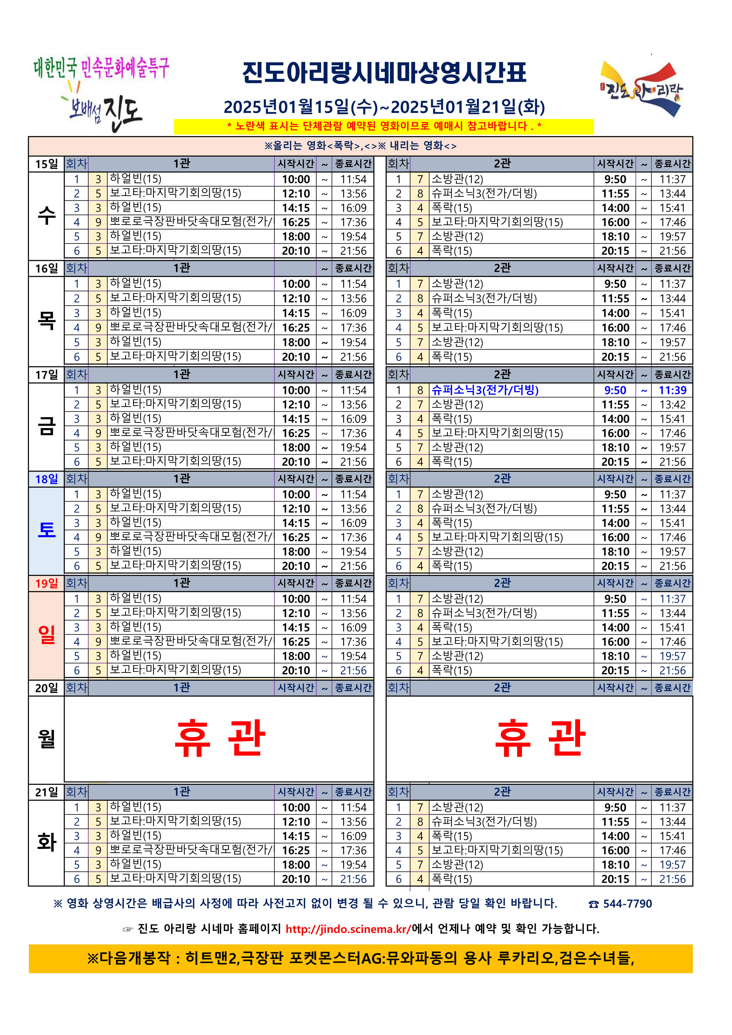 진도 아리랑 시네마 상영스케줄 <2025.01.15(수) ~ 01.21(화)> 안내드립니다.