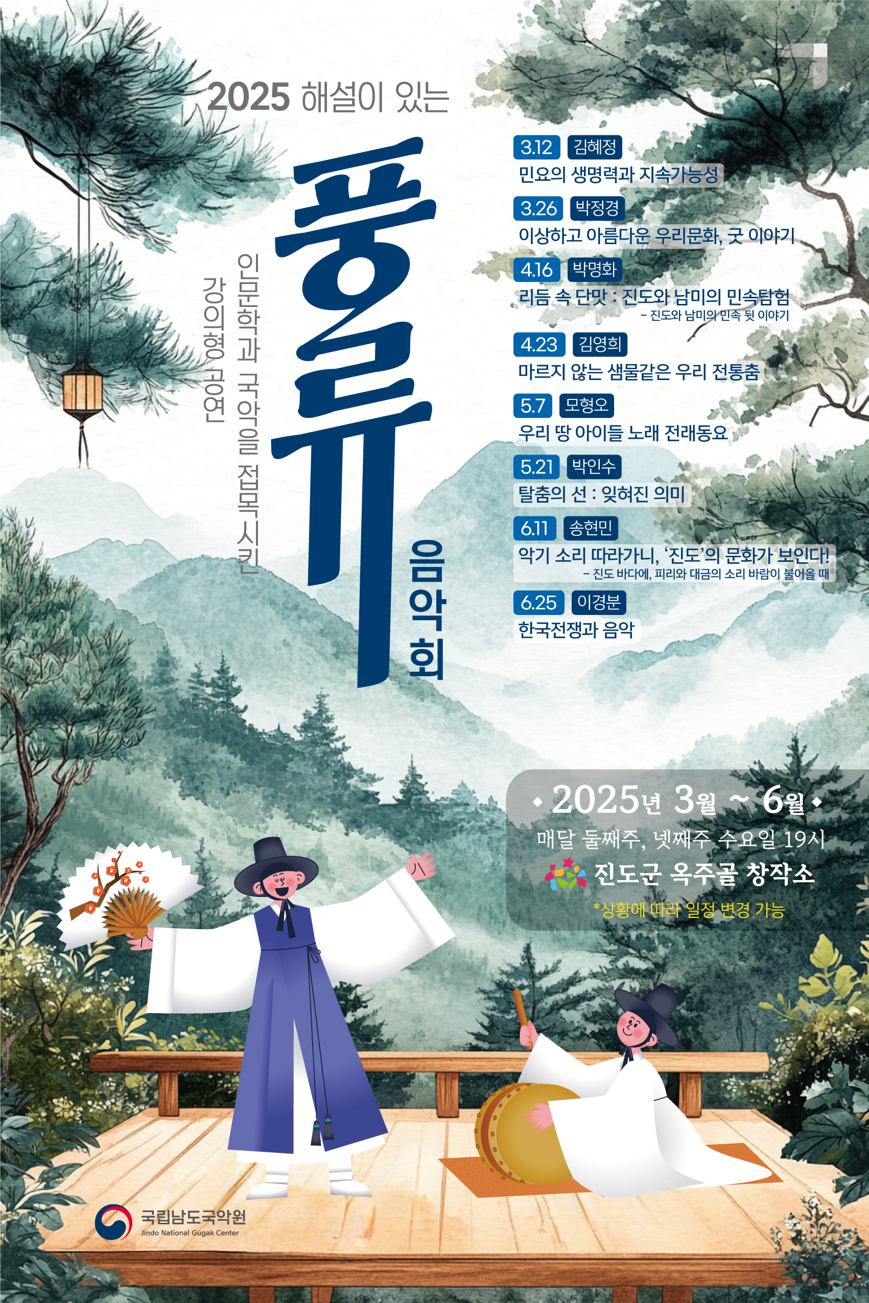 국립남도국악원이 주최하고 진도군 청년문화 아트컴퍼니 국악앙상블아리락, 진도군 옥주골창작소가 협업하는 2025해설이 있는 풍류음악회입니다. 회차별 30명 선착순 전화접수 입니다 문의-국립남도국악원 061- 540 - 4038 인문학과 국악을 접목시킨 강의형 공연입니다. 많은 관심 부탁드려요^^