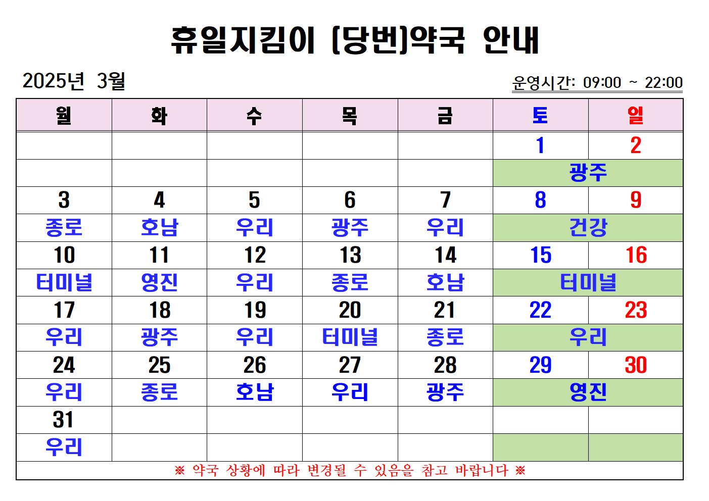 2025년 3월 휴일지킴이(당번)약국 운영 일정 안내