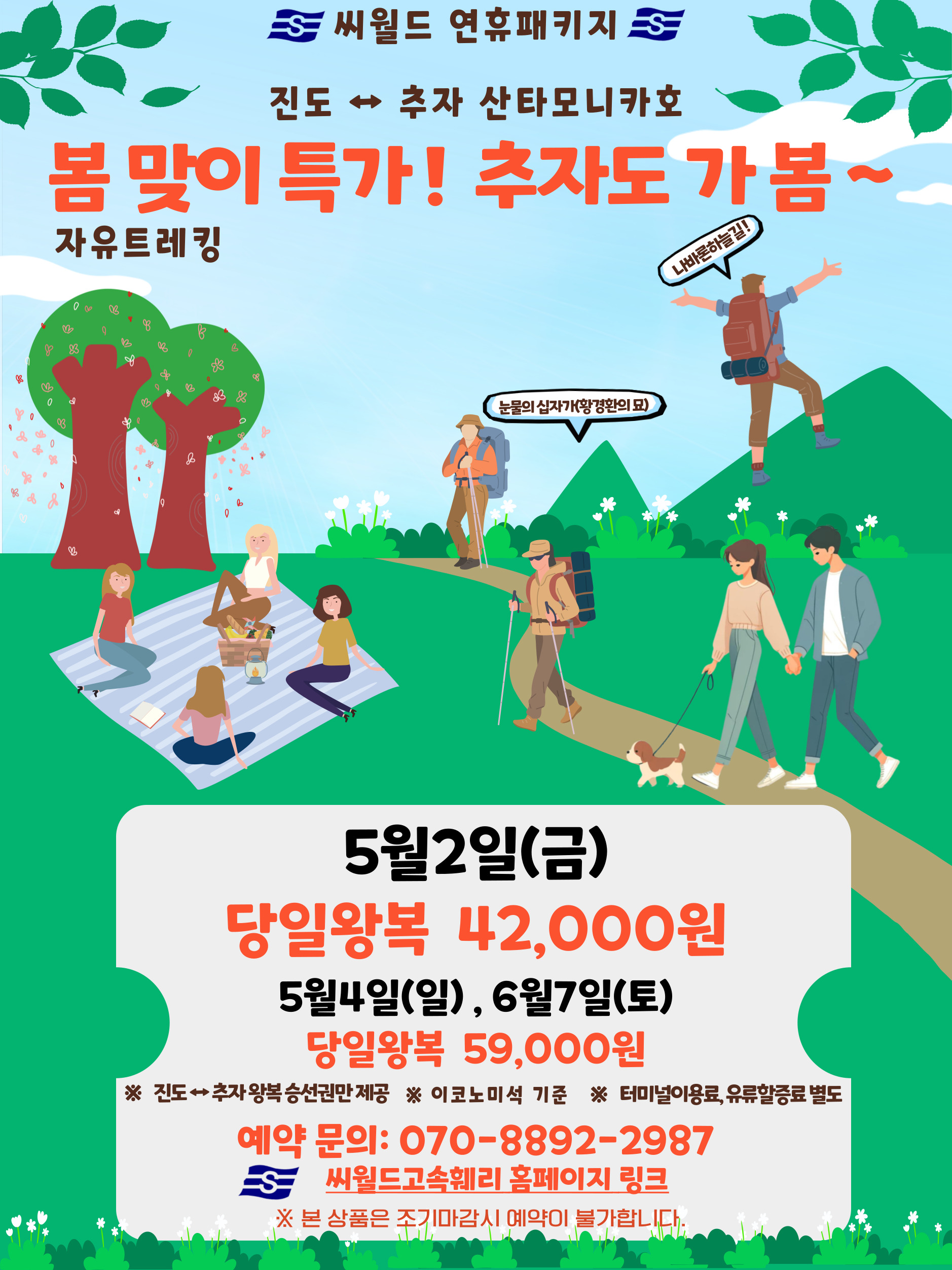 진도에서 추자까지 단 45분 ! ! 황금연휴에 내가 사랑하는 가족과 또는 반려견과 함께 추자도 트레킹 또는 여행은 어떠신가요 ~? 연휴에 있을수없는 대폭특가 ! ! 고민하는순간 잔여석 마감 ! ! https://www.seaferry.co.kr/shop/item.php?it_id=1742456021 예약문의 : 070-8892-2987