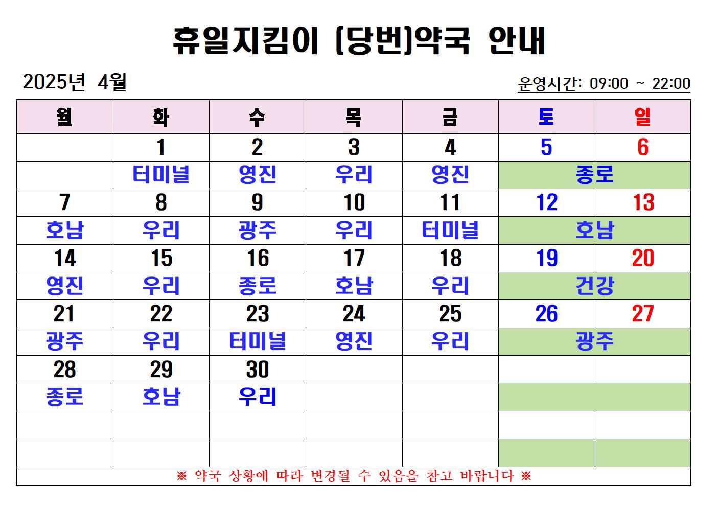2025년 4월 휴일지킴이 (당번)약국 운영 일정 안내