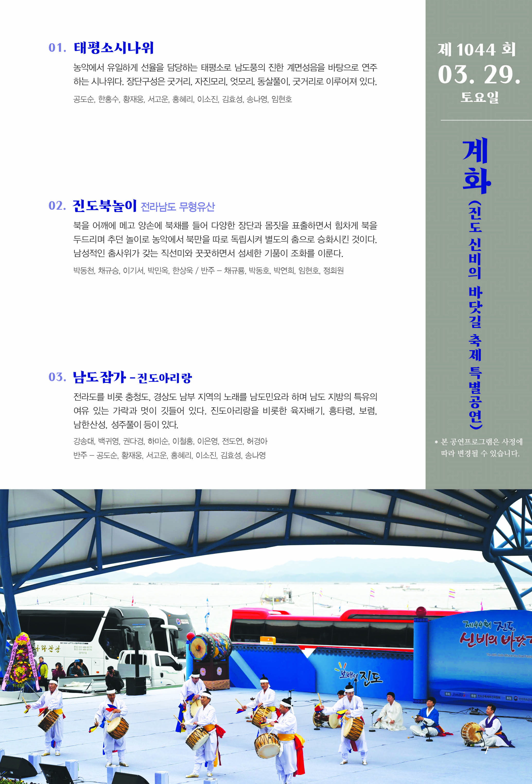 안녕하세요! 이번주 토요일 진도토요민속여행 상설공연은 제45회 진도신비의바닷길축제장에서 진행됩니다. ○ 공연일시: 3월 29일(토) 14:00 ~ 15:00 ○ 공연장소: 진도신비의바닷길 74(회동 주무대) ○ 문의: 061-540-3073