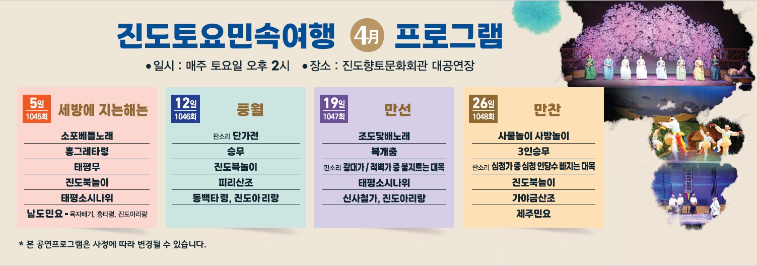 □ 공연개요 ○ 공연일시: 매주 토요일 오후 2시 ○ 관람료: 무료(선착순 입장) ○ 공연장소: 진도향토문화회관 대공연장 ○ 문의: 061-540-3073 많은 관람 바랍니다.