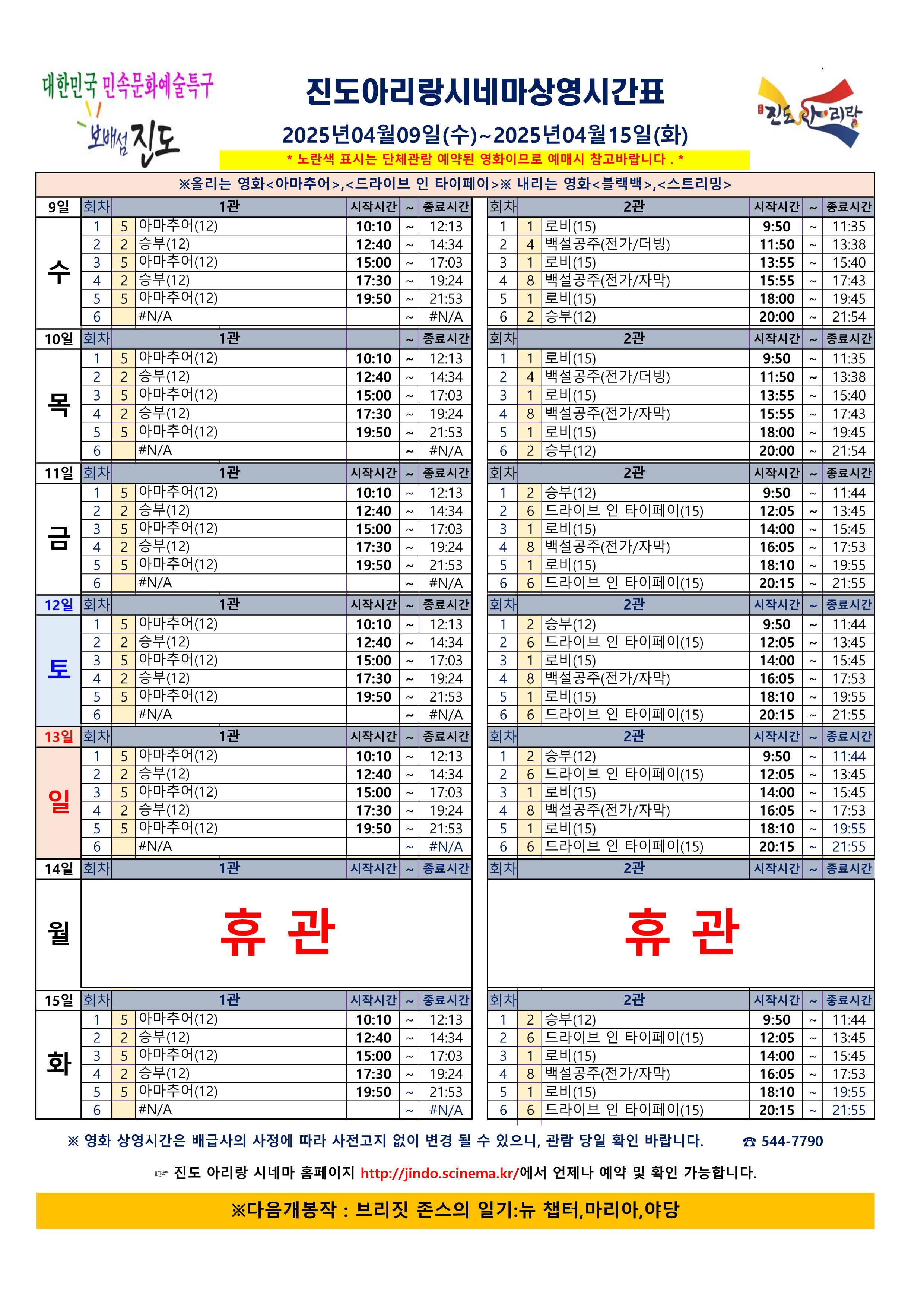 진도 아리랑 시네마 상영시간표 <2025.04.09(수) ~ 04.15(화)> 안내드립니다.