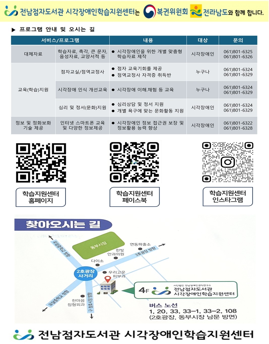 전남점자도서관 시각장애인학습지원센터는 전남 최초 시각장애인학습지원센터로, 성인 및 학령기 시각장애 학생들의 학습권 보장을 위해 개별 맞춤형 대체 자료 제작 등 다양한 활동을 진행하고 있습니다.