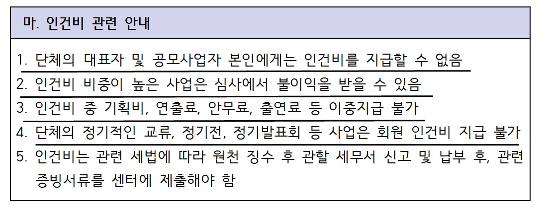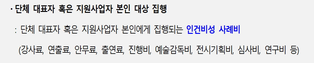 요지는 신청 단체 대표자 또는 지원사업자에게는 일체의 보조금을 지출할 수 없다는 것이다.