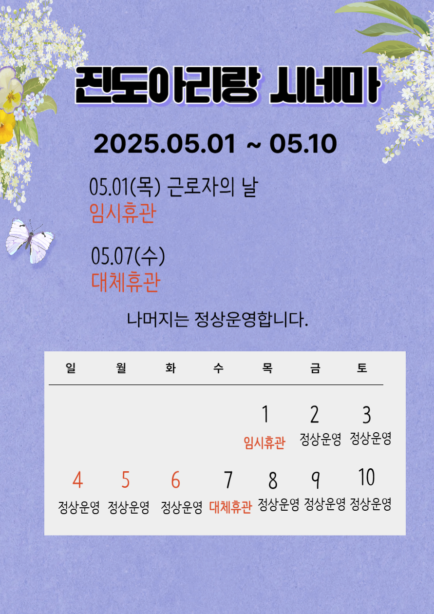 진도아리랑 시네마 상영시간표 <2025.04.30(수) ~ 05.06(화)> 안내드립니다.