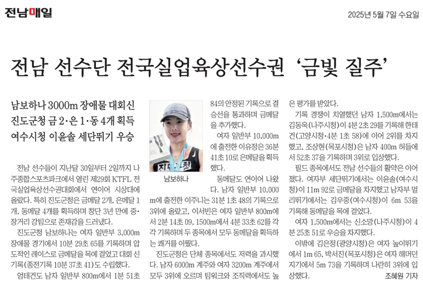 진도군청 육상팀, 전국실업선수권 금빛질주 남보하나 대회신기록