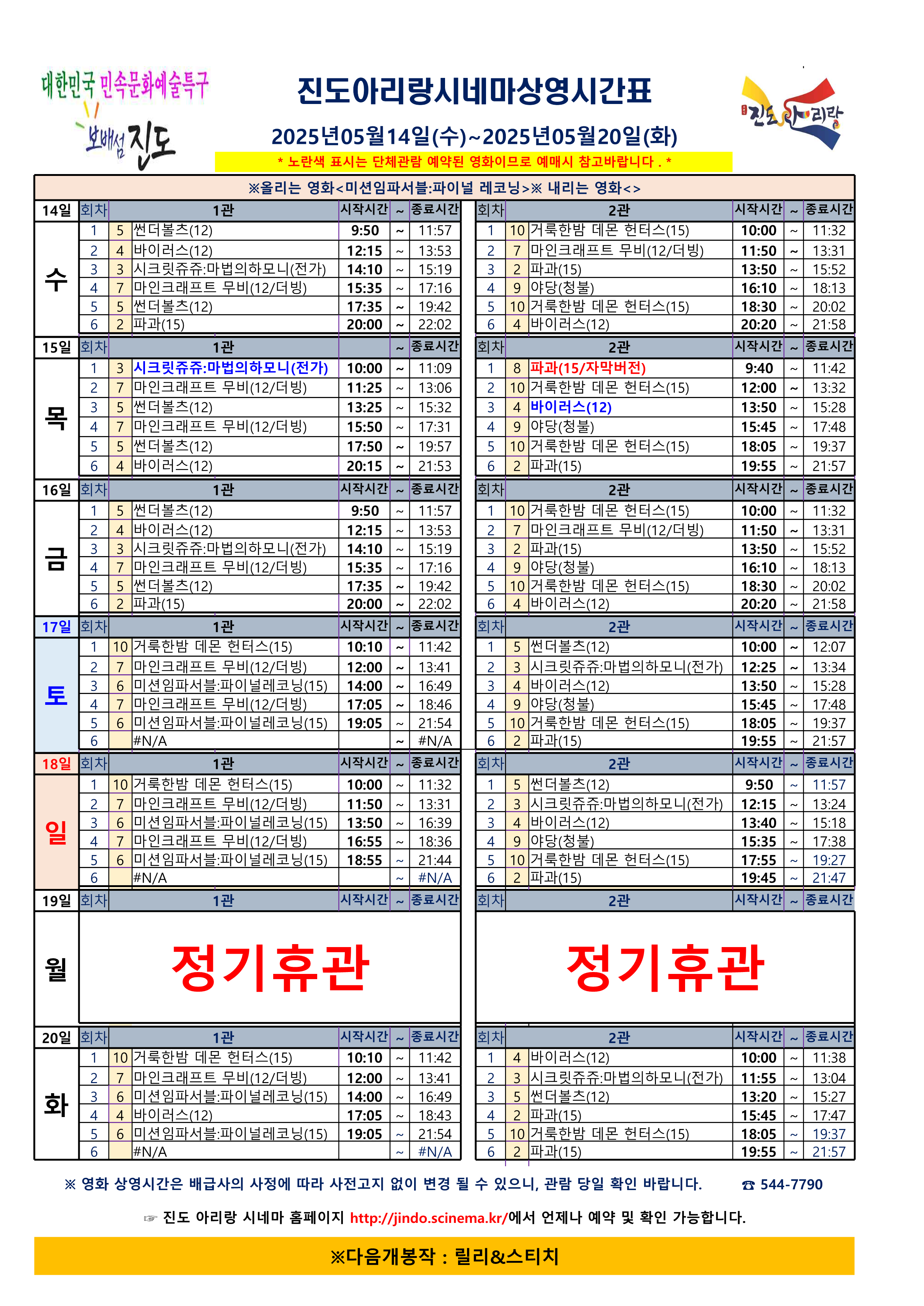 진도아리랑 시네마 상영시간표 <2025.05.14(수) ~ 05.20(화)> 안내드립니다.