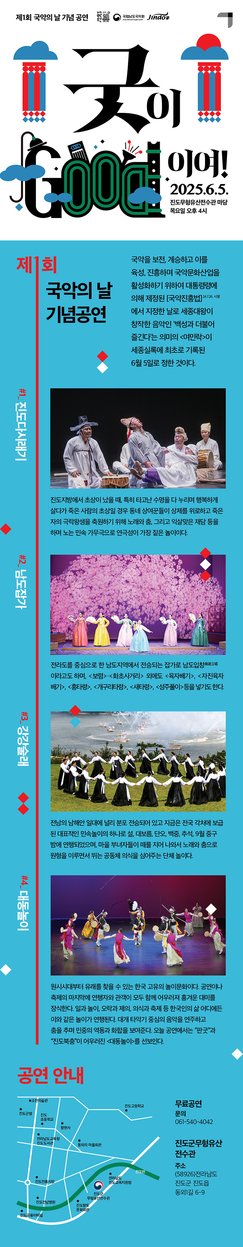 ▪ 출연: 국립남도국악원 국악연주단, 진도다시래기보존회, 강강술래보존회, 강송대(남도잡가 보유자) 등