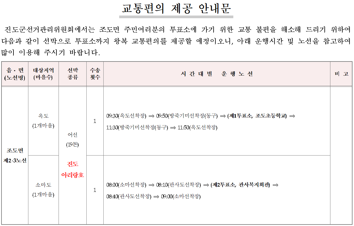 2025. 6. 3. 실시하는 제21대 대통령선거에 있어 교통불편지역 선거인에 대한 교통편의 제공을 다음과 같이 안내합니다. o 운행시간 : 2025. 6. 3.(화) 07:30 ~ 17: 20 o 운행노선 : 3개 노선